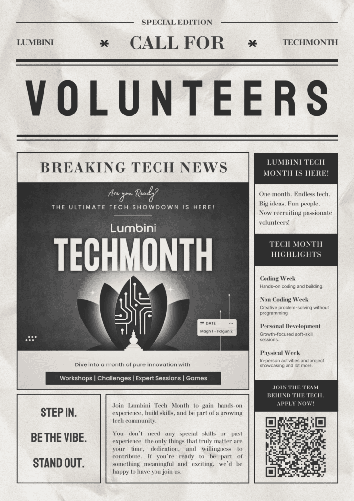 Exciting news! The call for volunteers for Lumbini Tech Month is officially live. If you’re passionate about technology, eager to learn, and want to be part of a dynamic team, this is your chance to contribute to one of the most exciting tech events in the region.